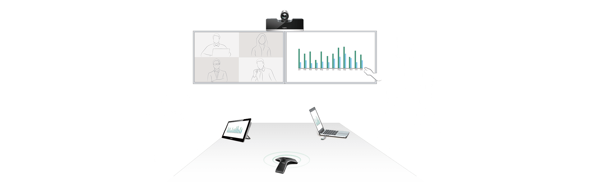 Yealink VC500 menghadirkan pengalaman konferensi tatap muka yang nyata untuk ruang pertemuan kecil dan menengah. Lensa sudut lebarnya menyediakan bidang pandang horizontal 83 derajat yang diperluas untuk memastikan bahwa semua orang di ruangan itu terlihat selama rapat. Dilengkapi dengan kamera PTZ optik 1080P60 dan 5X, VC500 menawarkan gambar yang jelas serta konsentrasi yang jelas.